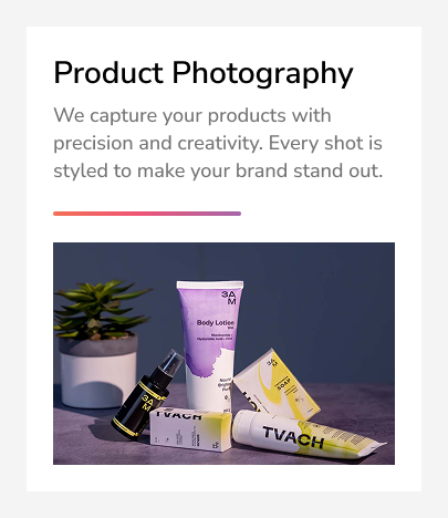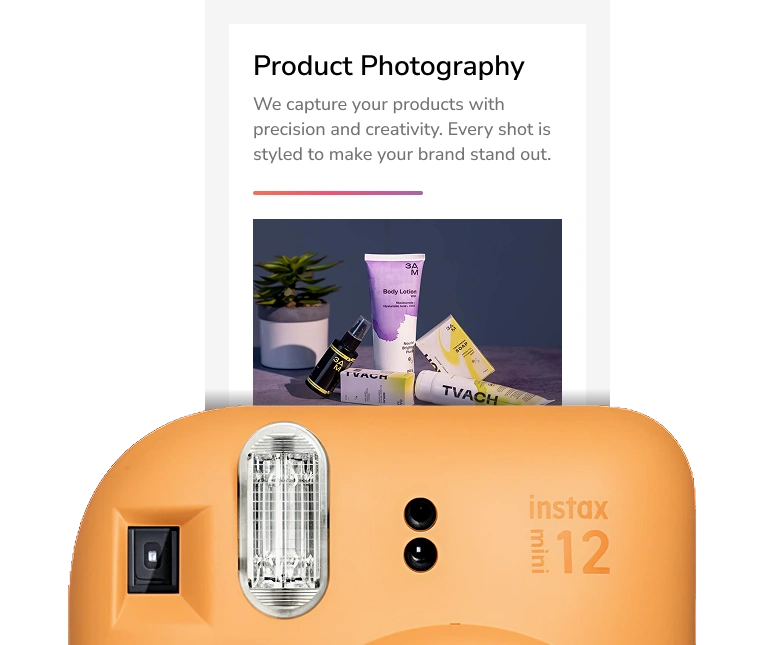 Product Photography We capture your products with precision and creativity. Every shot is styled to make your brand stand out.
